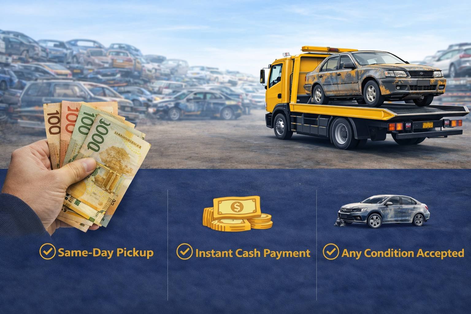Whether your car is junk, non-running, accidental, or simply no longer needed, we buy all types of vehicles and pay you on the spot — no delays, no hidden charges.